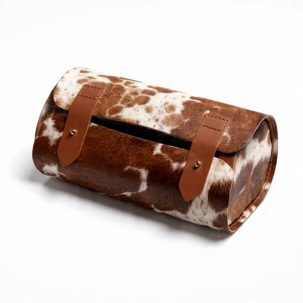 Celebrate natural craftsmanship with this rustic cowhide leather clutch, designed for those who appreciate authentic textures and earthy tones. Made from genuine cowhide, each piece showcases a naturally unique pattern that adds character and individuality. The structured roll design and durable strap closure combine functionality with standout style, perfect for refined everyday carry or statement occasions.